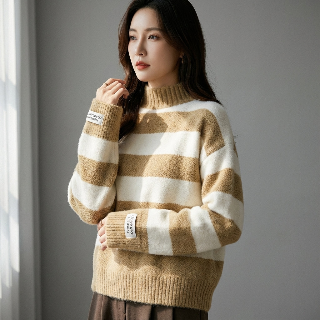 Este suéter listrado de gola alta rapidamente se tornará um item essencial em seu guarda-roupa, adicionando um toque de elegância coreana a todos os seus looks.