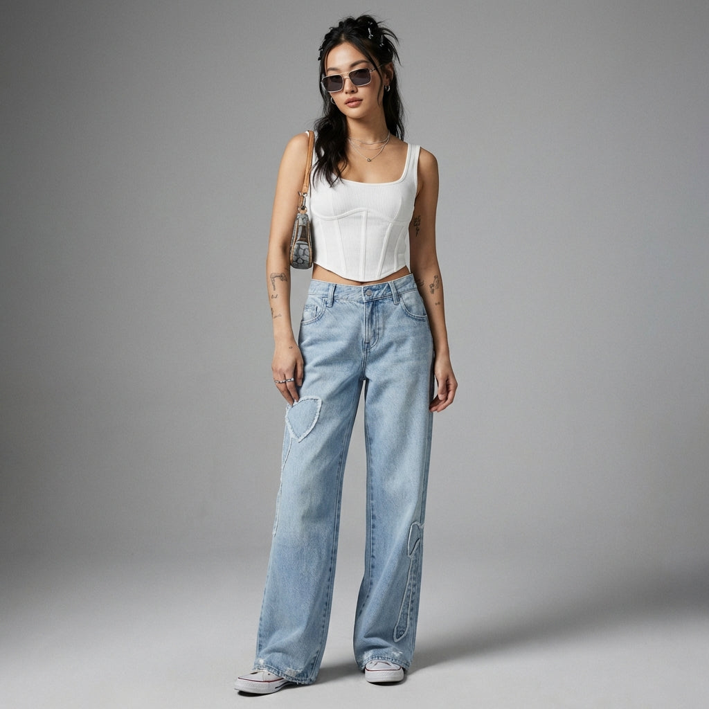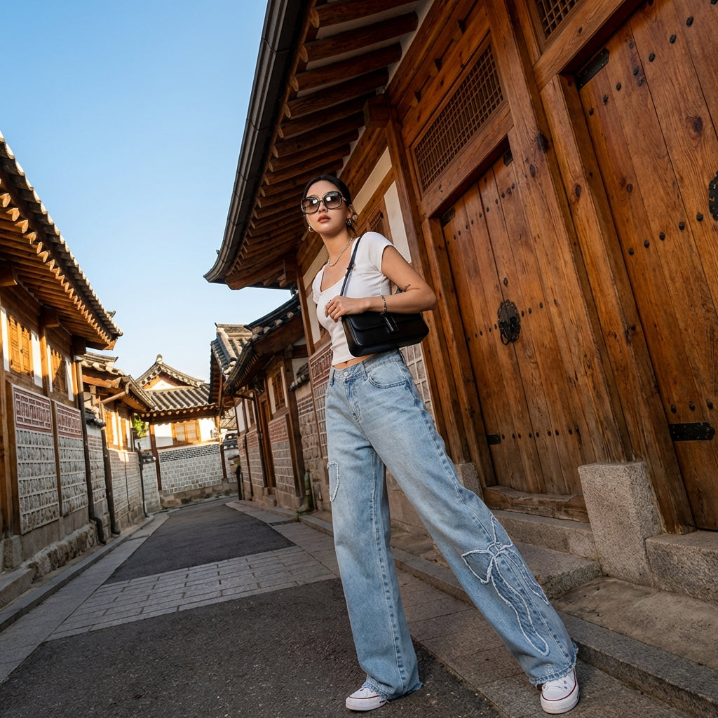 Esta calça jeans é uma peça essencial para quem deseja expressar sua personalidade através de um estilo único, combinando conforto, tendência e um aceno à K-fashion.
