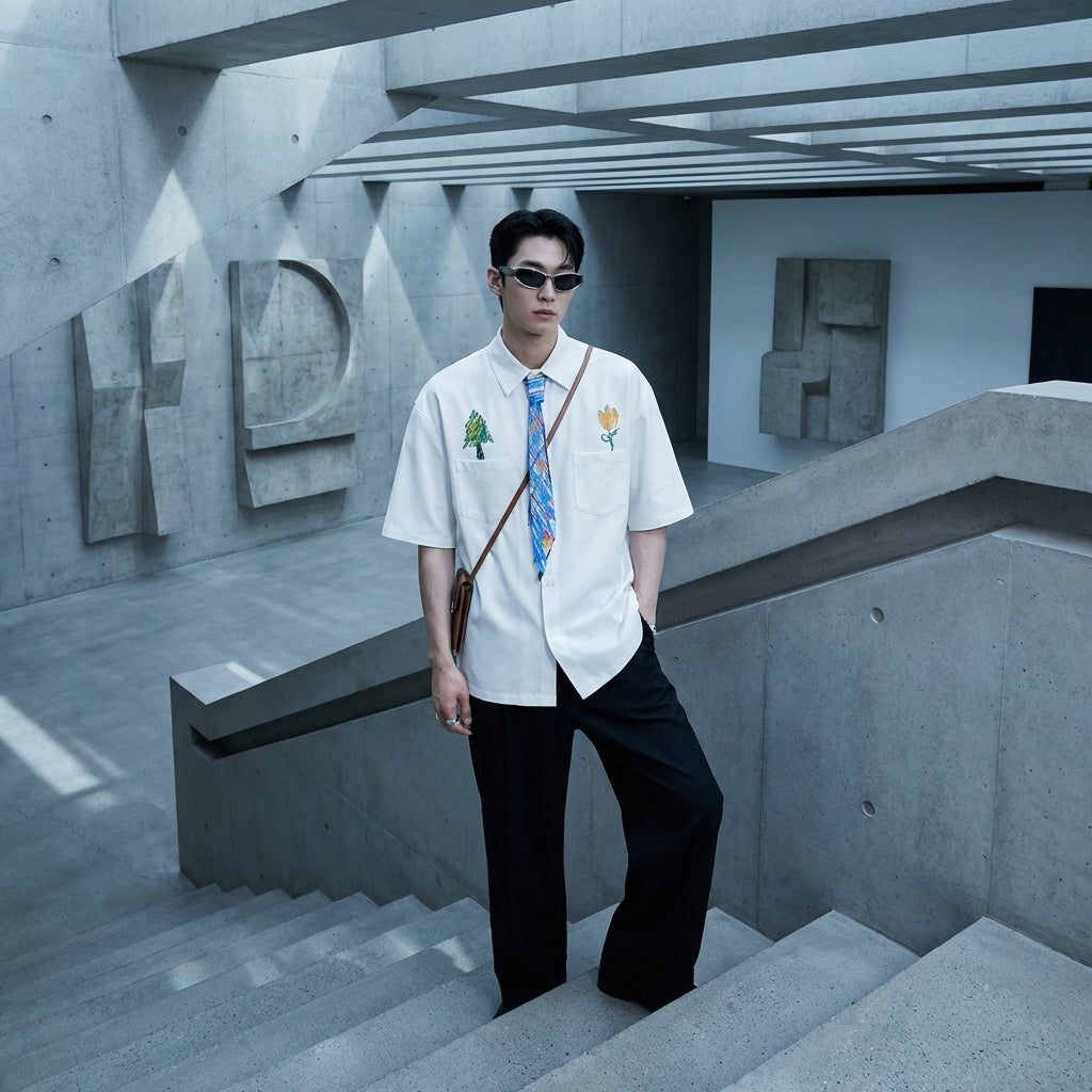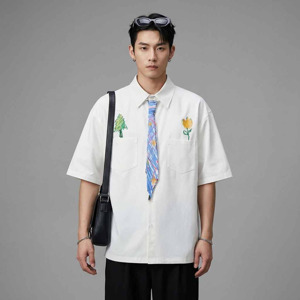 - Estilo: Streetwear, K-fashion, Urbano. Esta camisa incorpora o espírito da moda coreana com um toque artístico e descontraído, perfeita para um visual moderno.