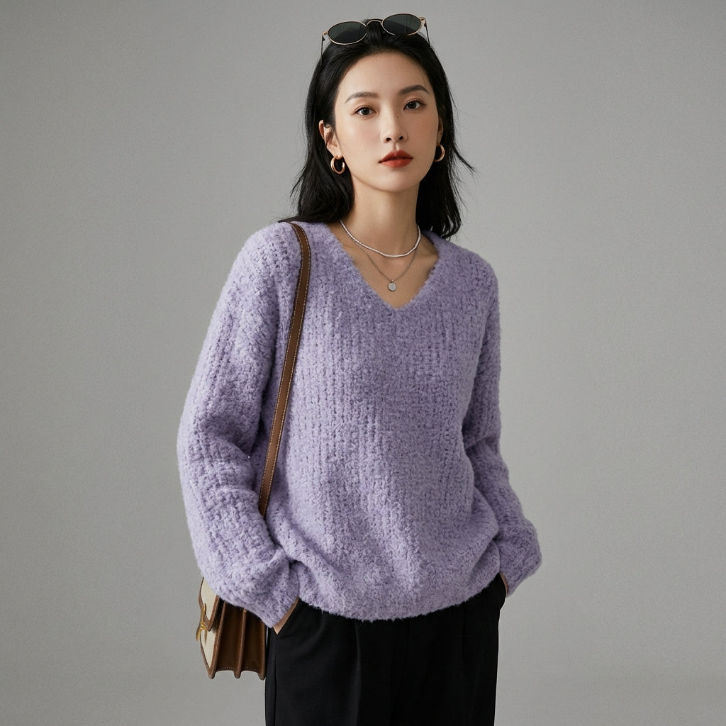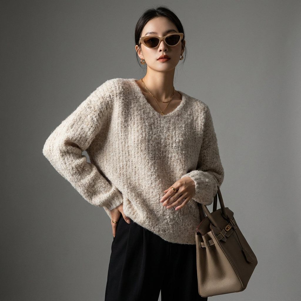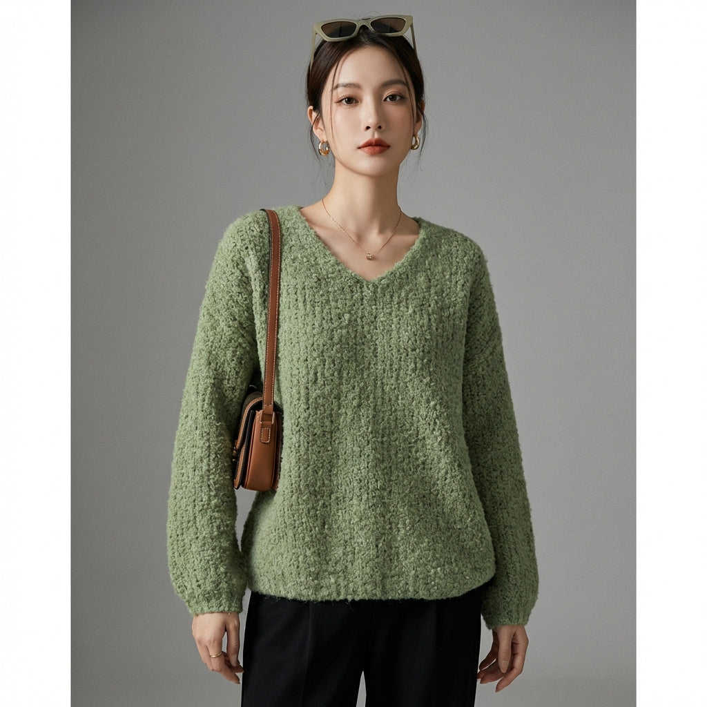Adote o conforto e o estilo com nosso suéter folgado de gola V, perfeito para todas as ocasiões casuais. Seu corte descontraído e cores suaves o tornam um item essencial em seu guarda-roupa para um visual moderno e sem esforço! ✨