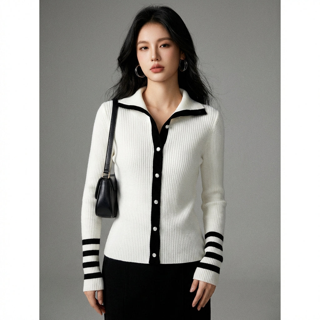 Cardigan tricoté bicolore blanc, style français décontracté - Koreanxwear