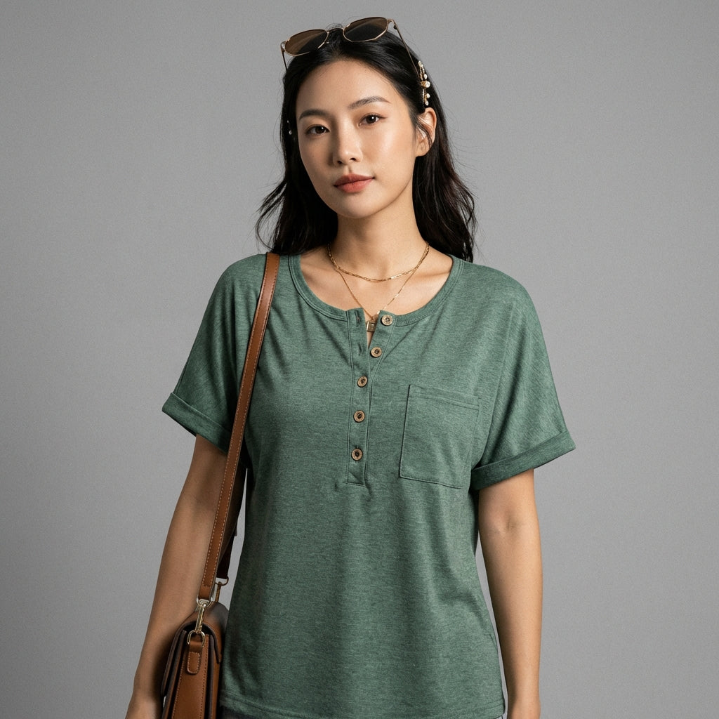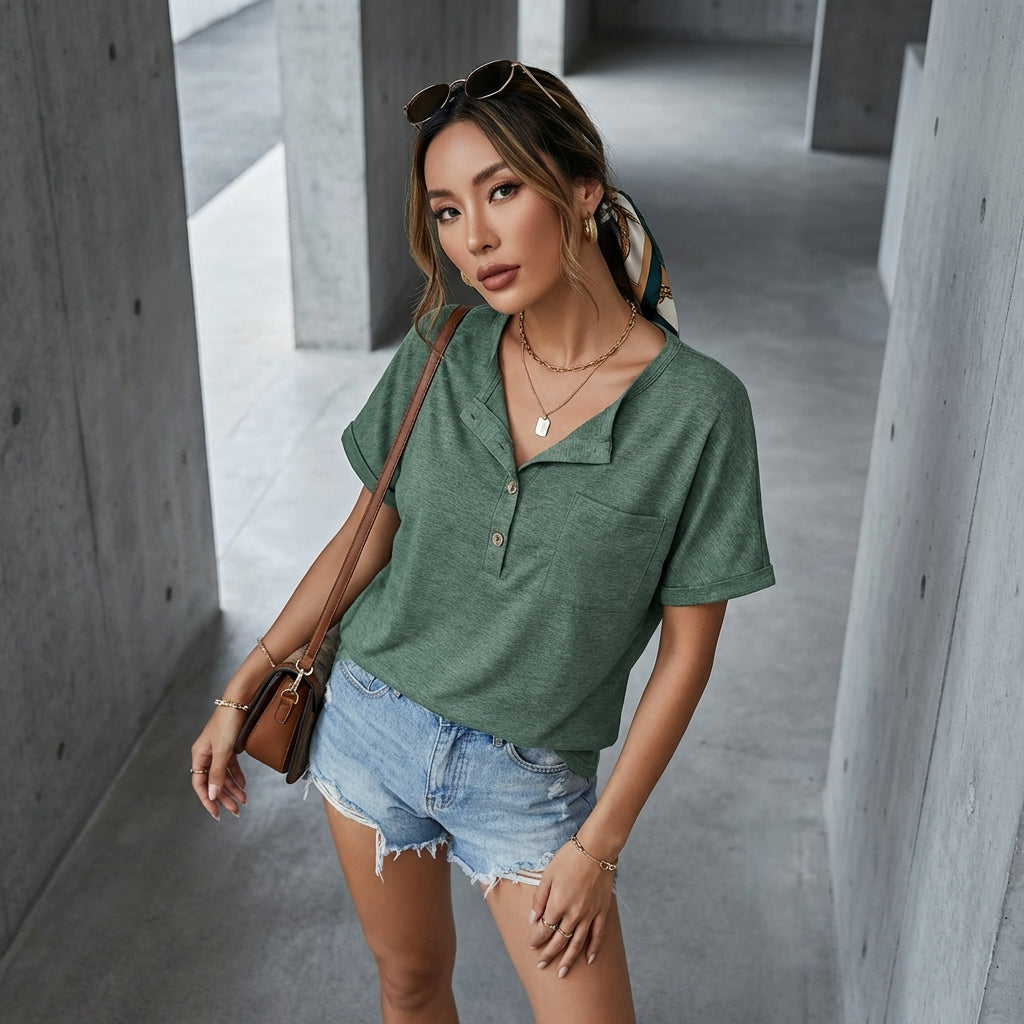 T-Shirt vert décontracté à manches courtes avec boutons et poches - K-fashion