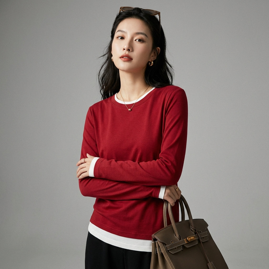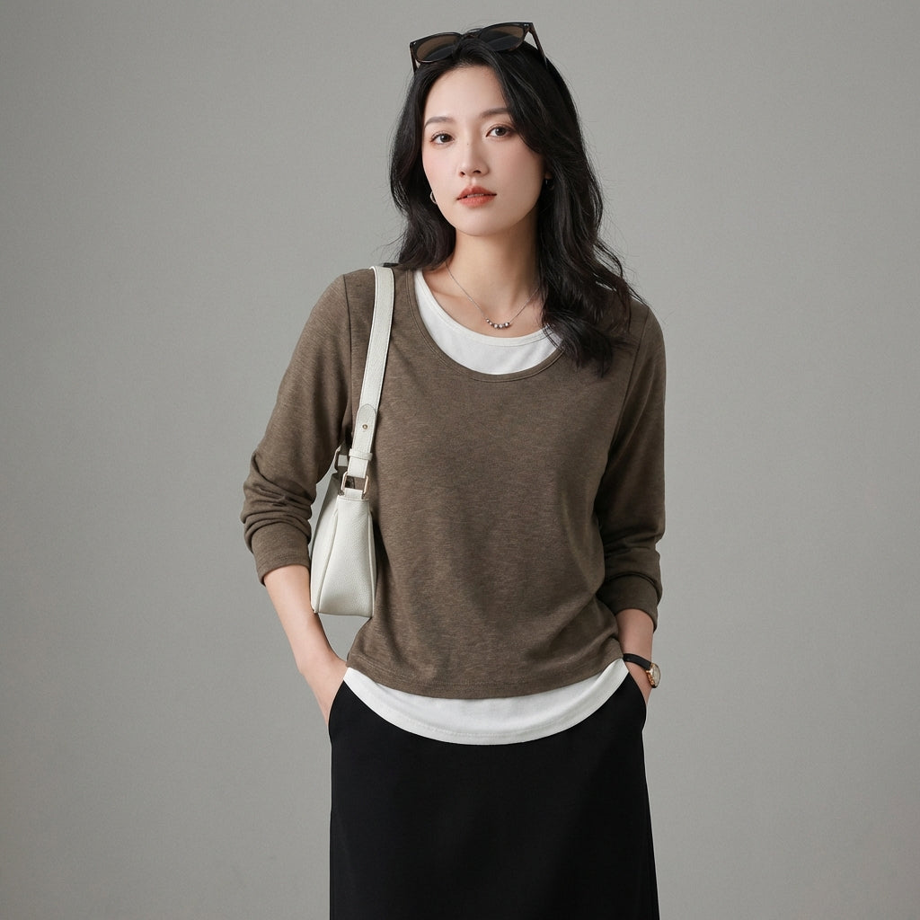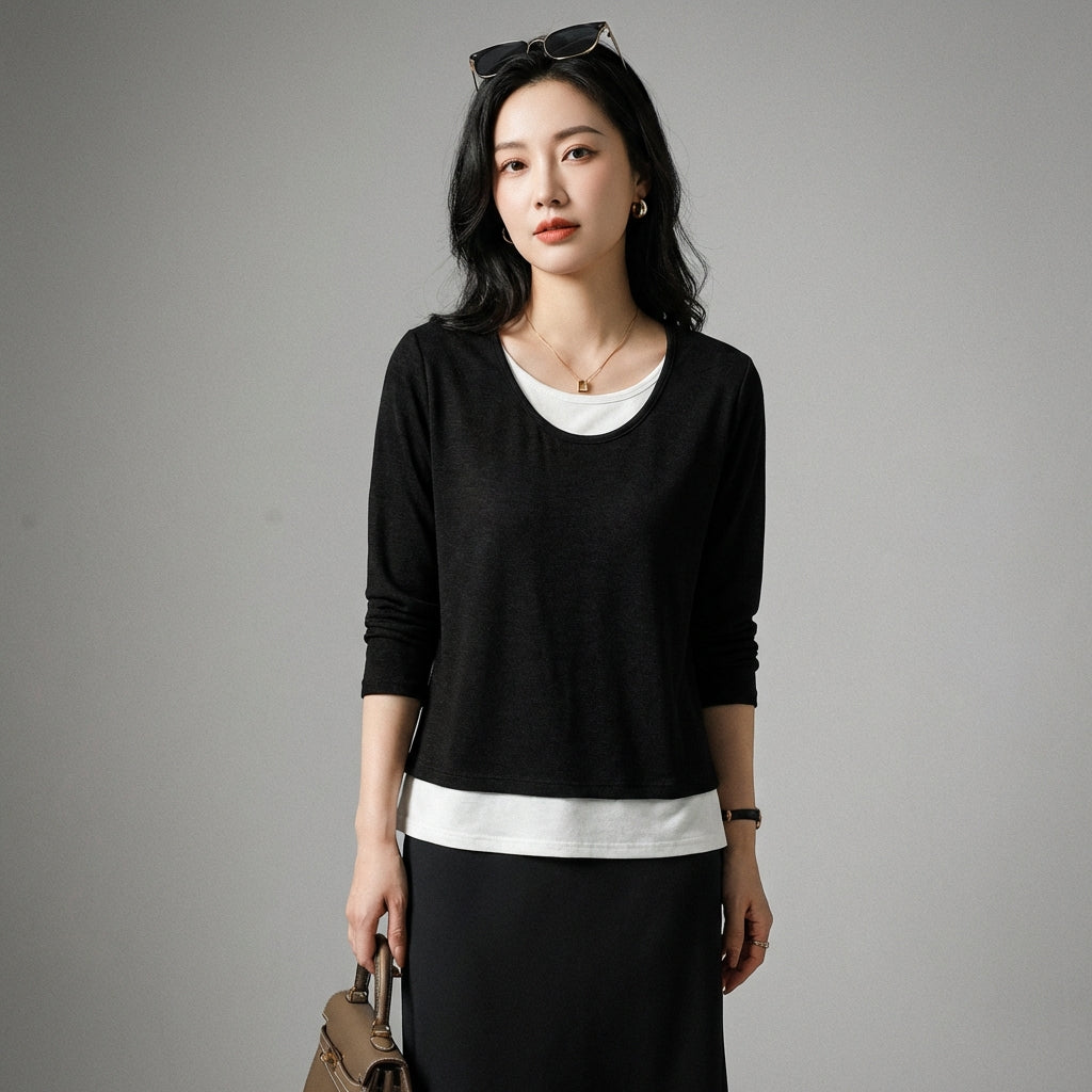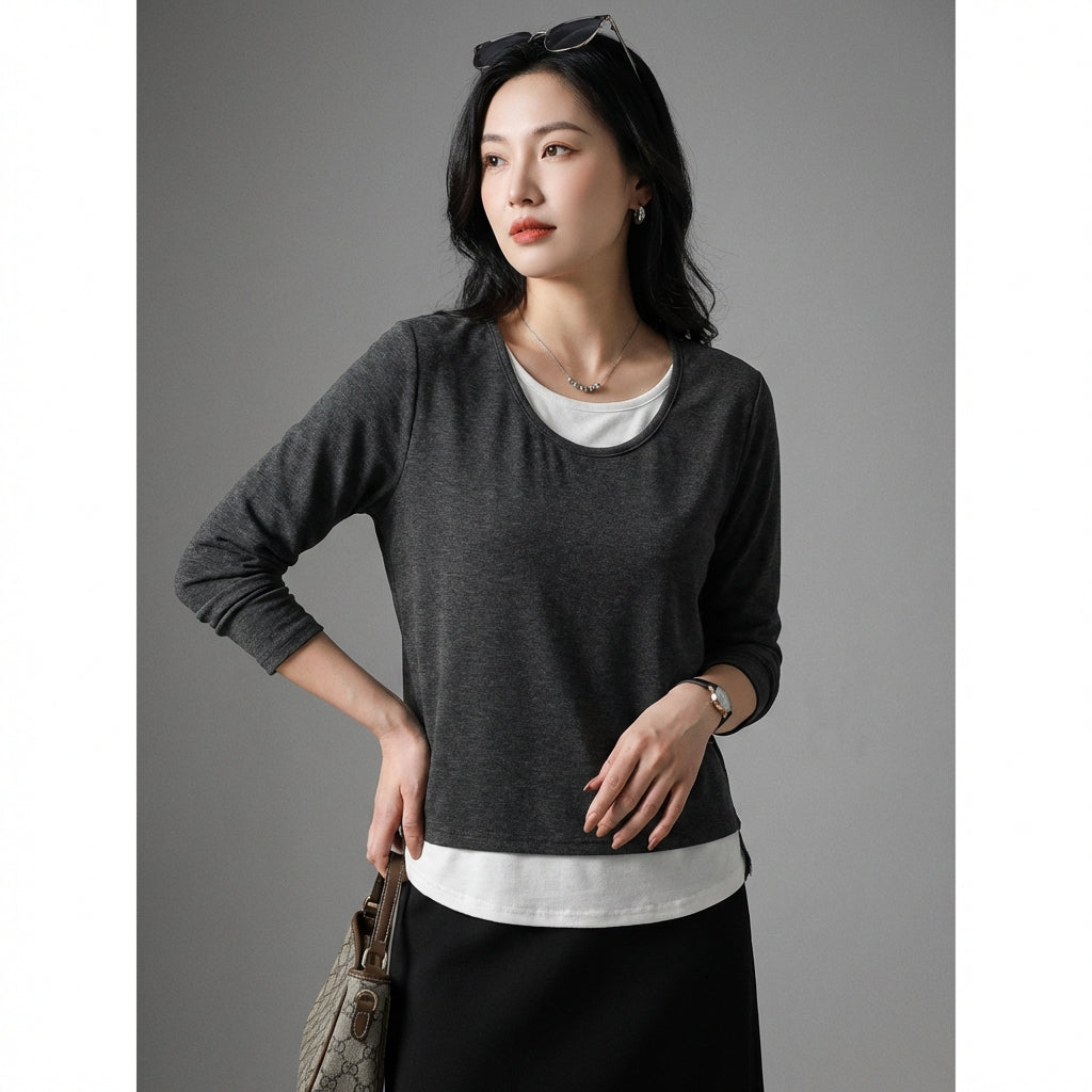 Adoptați un look casual și versatil cu tricoul nostru cu mâneci lungi, cu efect de două piese. Designul său inteligent creează o suprapunere fără efort, perfectă pentru un stil simplu și la modă în același timp. Un element esențial pentru garderoba dumneavoastră modernă! ✨