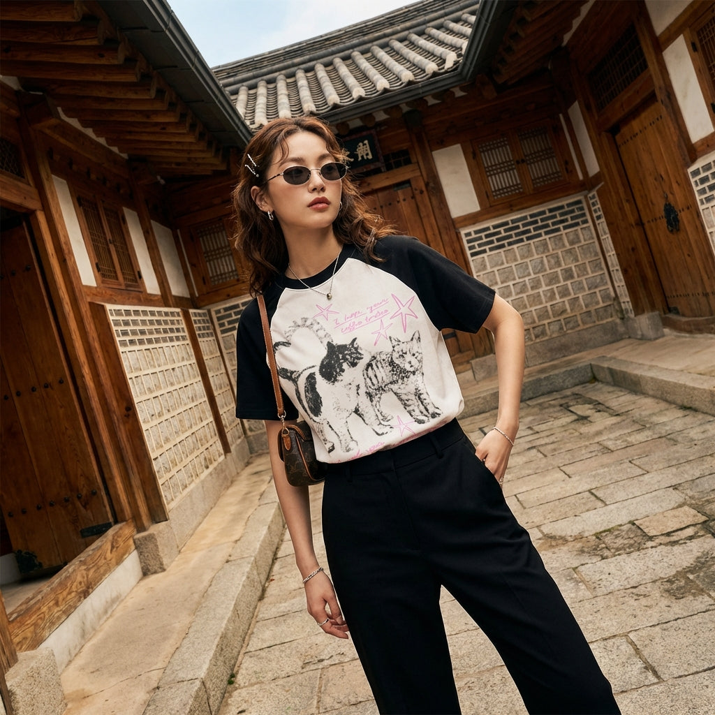 - Stil: Streetwear, Trendy, K-fashion. Acest tricou întruchipează spiritul modei urbane coreene cu o notă retro, perfect pentru cele cărora le place să iasă în evidență.