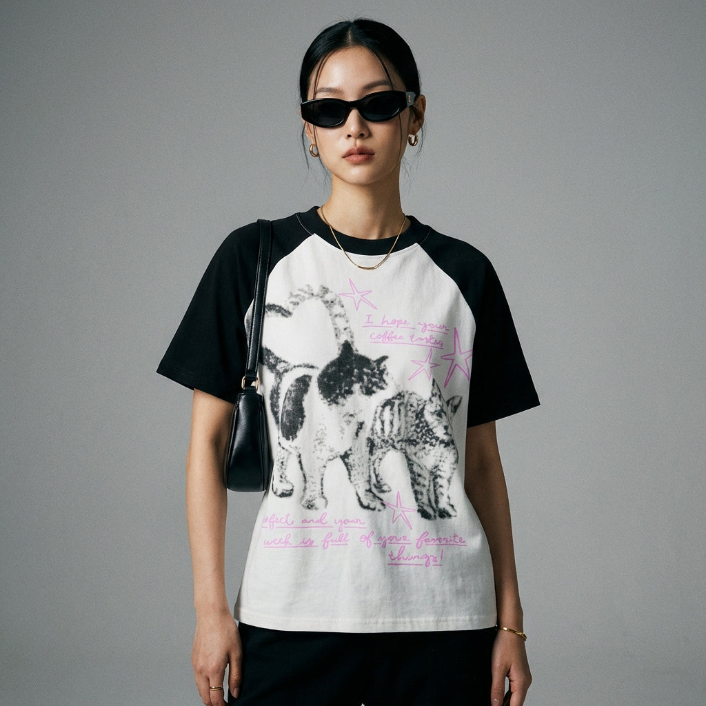 Afirmă-ți stilul cu tricoul nostru scurt cu mâneci scurte, împodobit cu un imprimeu retro cu pisici. Croiala sa ajustată și designul său unic îl fac un must-have pentru un look la modă și îndrăzneț! 😼