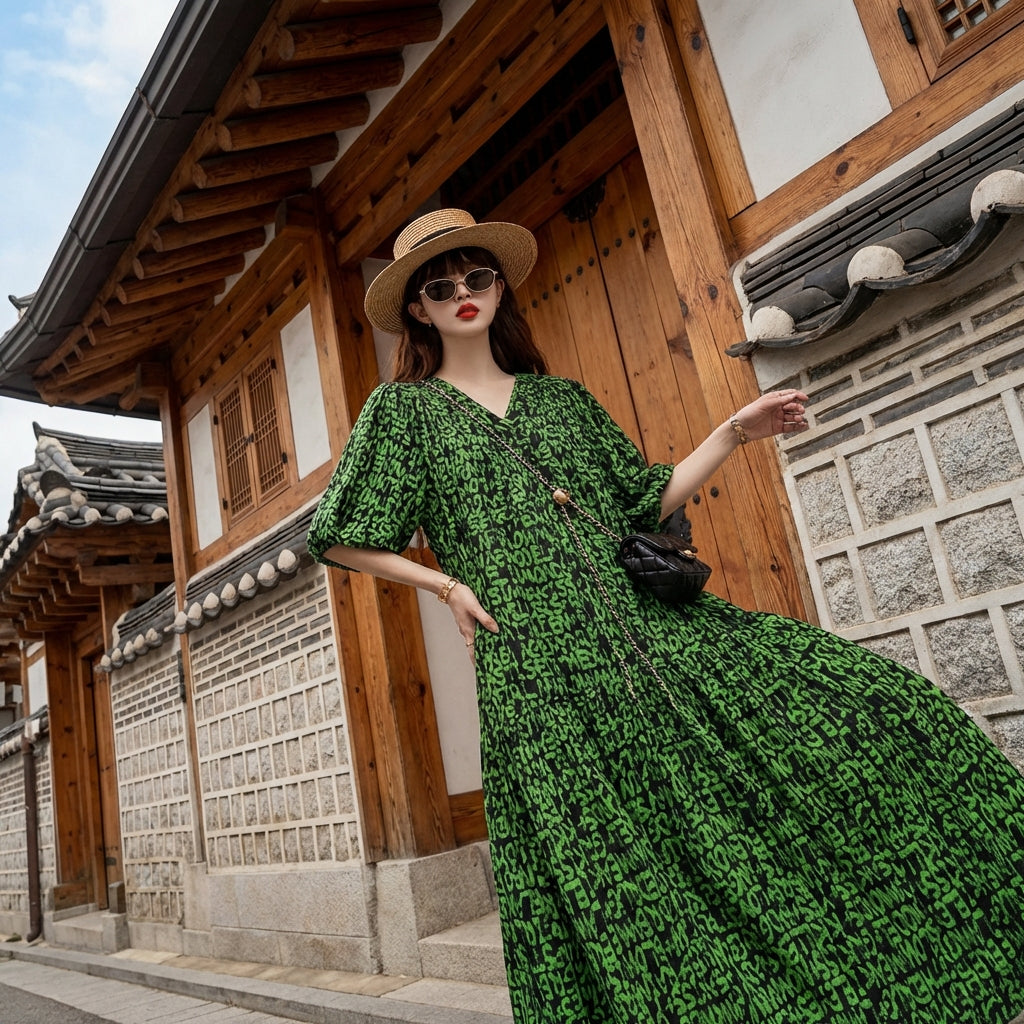 - Stil: Koreanskt mode, Streetwear, Bohemian Chic. Denna klänning förkroppsligar den fria och moderna andan i koreanskt mode, perfekt för en avslappnad men stilfull look.