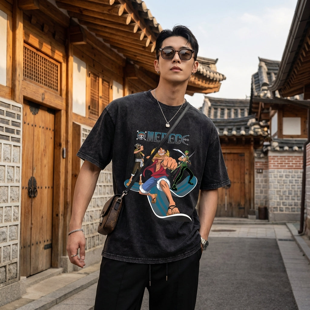 Uttryck din stil med vår urtvättade, manga-inspirerade T-shirt, perfekt för en unik streetwear-touch. Dess djärva tryck och bekväma passform gör den till ett måste för anime- och urban mode-fans! 👕