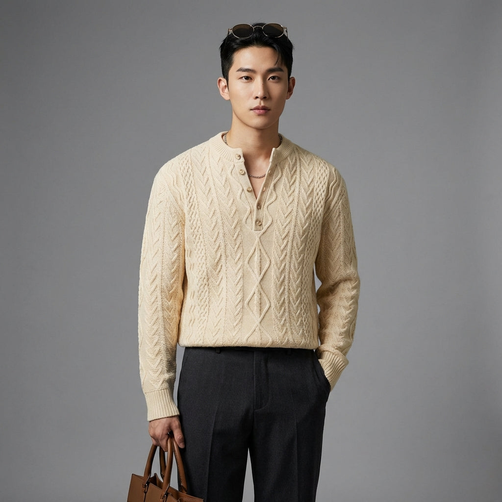 - ประเภท: เสื้อสเวตเตอร์แขนยาว, คอกลม ทรงคลาสสิกเหนือกาลเวลา เป็นสิ่งจำเป็นสำหรับตู้เสื้อผ้าของผู้ชายทุกคน