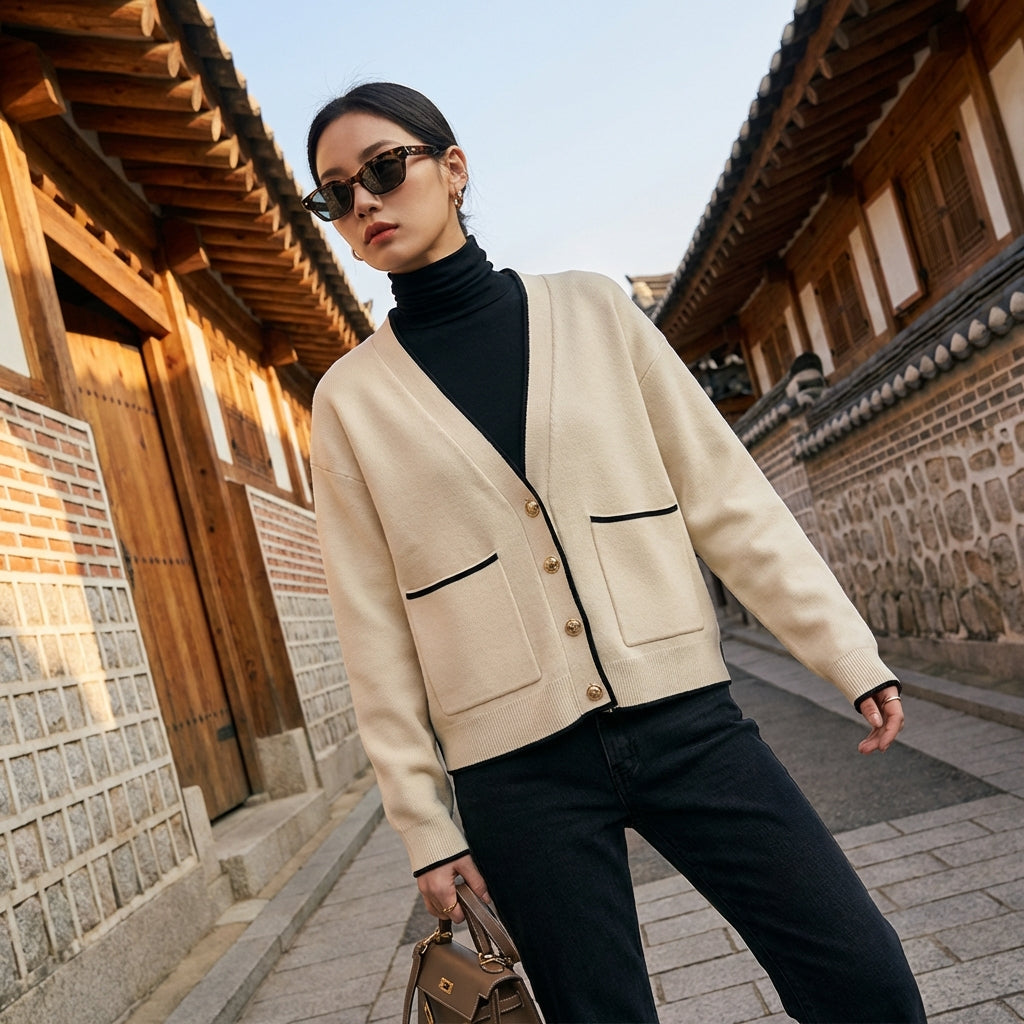 - สไตล์: แฟชั่นเกาหลี, ลำลอง, มินิมอล คาร์ดิแกนนี้รวบรวมความสง่างามที่เรียบง่ายและผ่อนคลาย ซึ่งเป็นที่นิยมอย่างมากใน K-fashion
