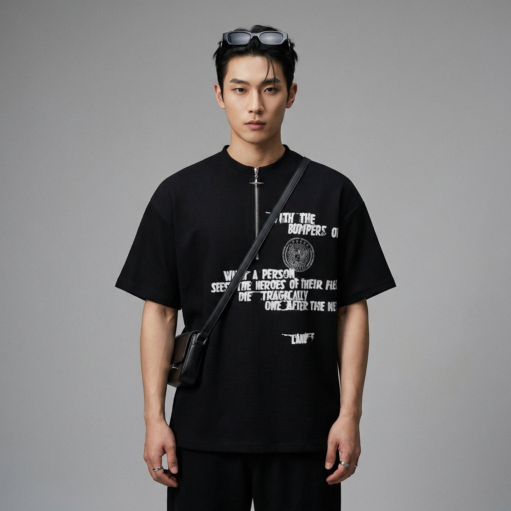 แสดงสไตล์สตรีทของคุณด้วยเสื้อยืดแขนสั้นคอกลมของเรา มาพร้อมซิปครึ่งตัวและทรงหลวม เสื้อตัวนี้เป็นเทรนด์ที่สมบูรณ์แบบสำหรับลุคลำลองและทันสมัย เหมาะสำหรับทุกกิจกรรมช่วงฤดูร้อนของคุณ! 👕
