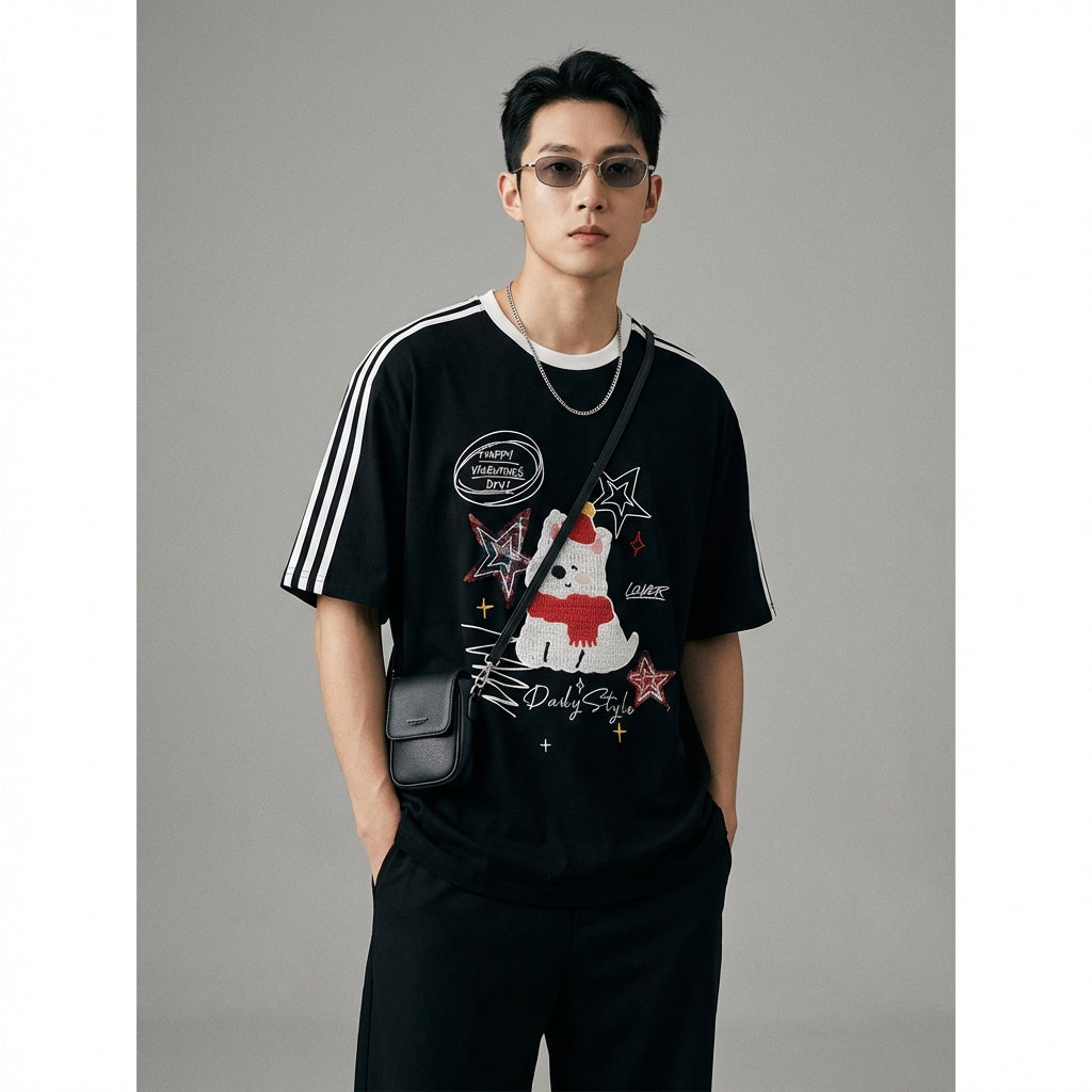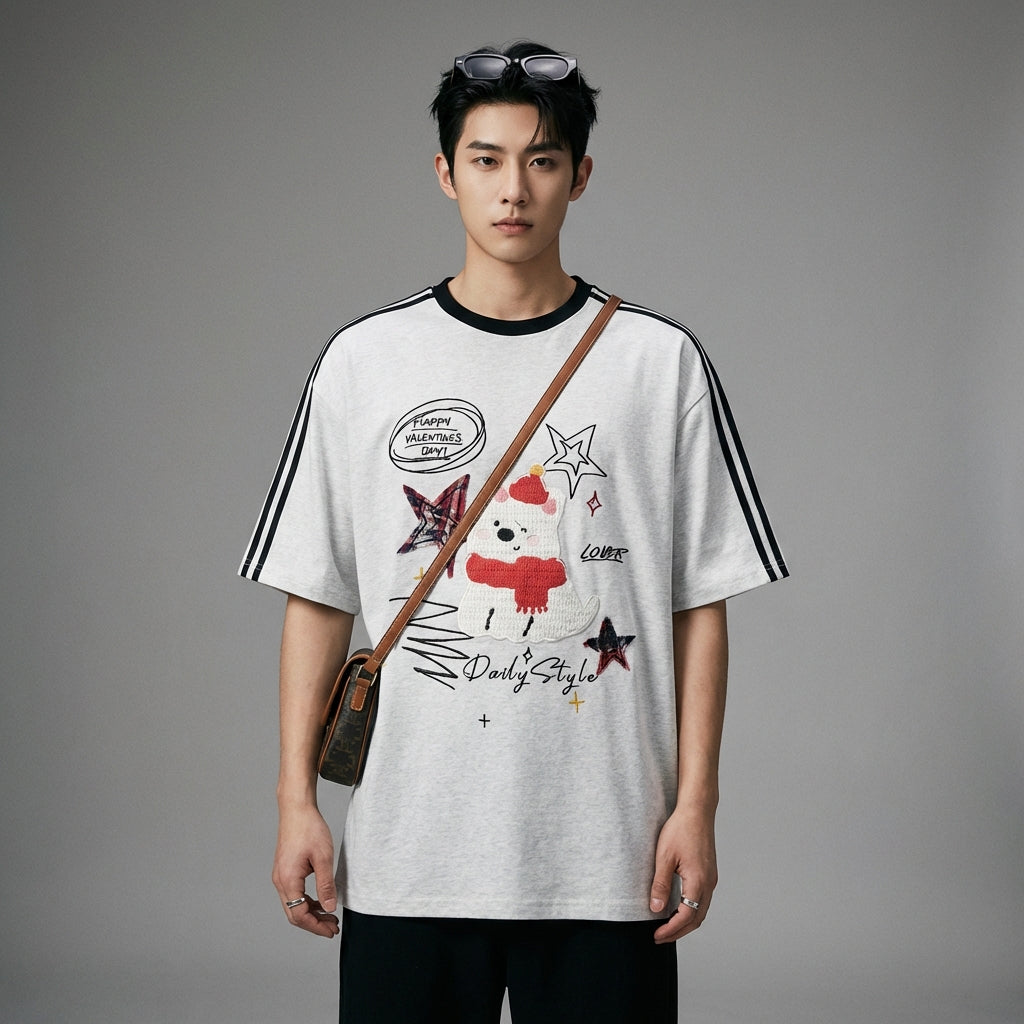 สวมใส่ลุคสบายๆ แต่ทันสมัยด้วยเสื้อยืดโอเวอร์ไซส์ยูนิเซ็กส์ของเรา ที่ได้รับแรงบันดาลใจจากสไตล์เรโทรอเมริกัน ตกแต่งด้วยลายปักรูปสุนัขน่ารักและลายสามแถบอันเป็นเอกลักษณ์ เสื้อแขนสั้นตัวนี้เหมาะสำหรับสไตล์คู่รัก หรือลุคสบายๆ แต่มีสไตล์! 🐾